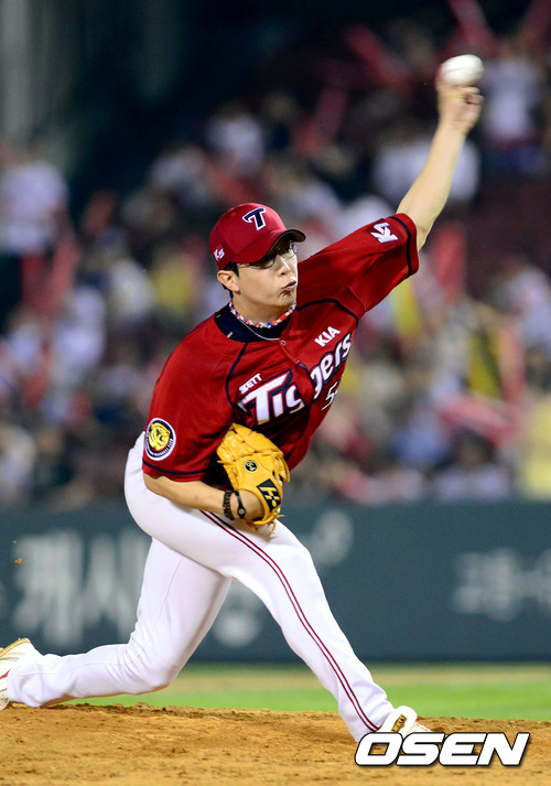 28일 오후 서울 잠실구장에서 열린 '2012 팔도 프로야구' LG 트윈스와 KIA 타이거즈의 경기, 8회말 1사 1,2루 KIA 양현종이 마운드에 올라 역투하고 있다.