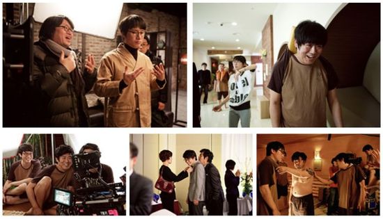 공개된 스틸에서는 과도한 아부 부작용을 이기기 위한 속풀이 체조를 연습하고 있는 송새벽과 정승구 감독의 모습, 찜질방 촬영 중 목침을 옷 속에 끼고 장난기 가득한 웃음을 짓고 있는 성동일의 모습을 확인할 수 있다.