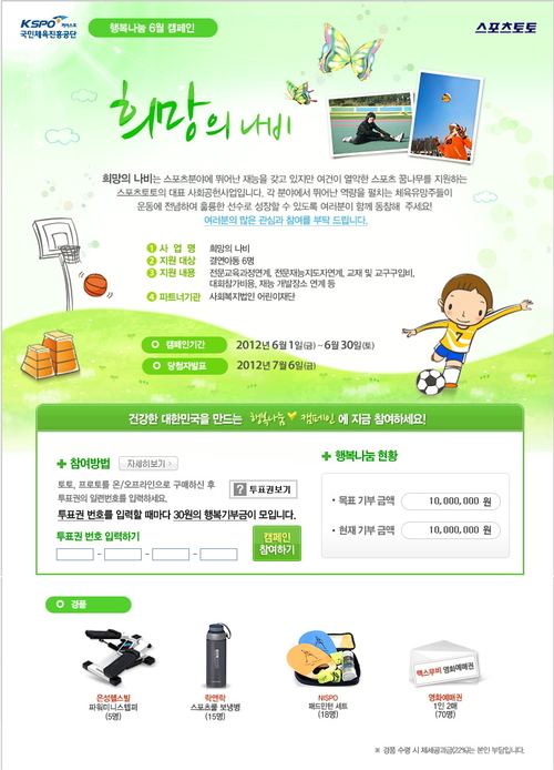 건전한 기부문화 정착을 위해 실시하는 행복나눔 캠페인은 매달 1000만원을 목표로 스포츠토토 팬들의 기부금을 모아 어려운 이웃을 돕는 이벤트다. 6월에 적립된 기부금은 사회복지법인 '어린이재단'과 함께 진행하는 '희망의 나비' 사업에 쓰이게 된다.