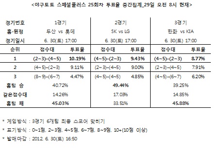 2012 프로야구 주말 3경기 대상 야구토토 스페셜플러스 25회차 투표율 중간집계