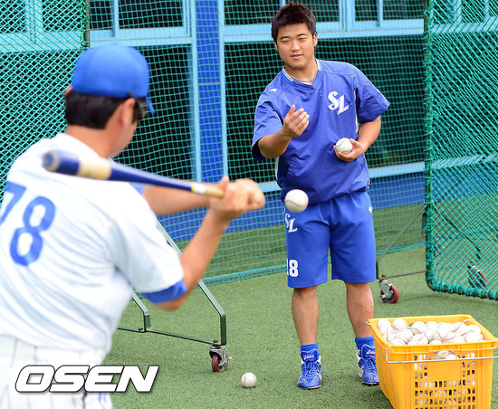 29일 오후 대구구장에서 열리는 2012 팔도 프로야구 삼성 라이온즈와 넥센 히어로즈의 경기 전 삼성 박석민이 박용국 코치에게 배팅볼을 던지고 있다