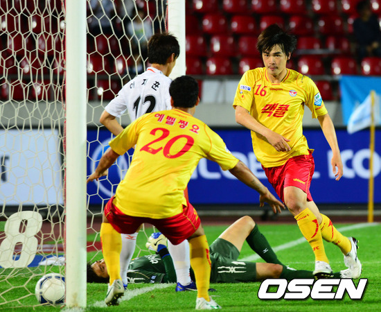 30일 오후 성남 탄천 종합운동장에서 열린 '현대오일뱅크 K리그 2012' 성남 일화와 강원 FC의 경기 후반, 성남 김성환이 동점골을 넣고 있다.