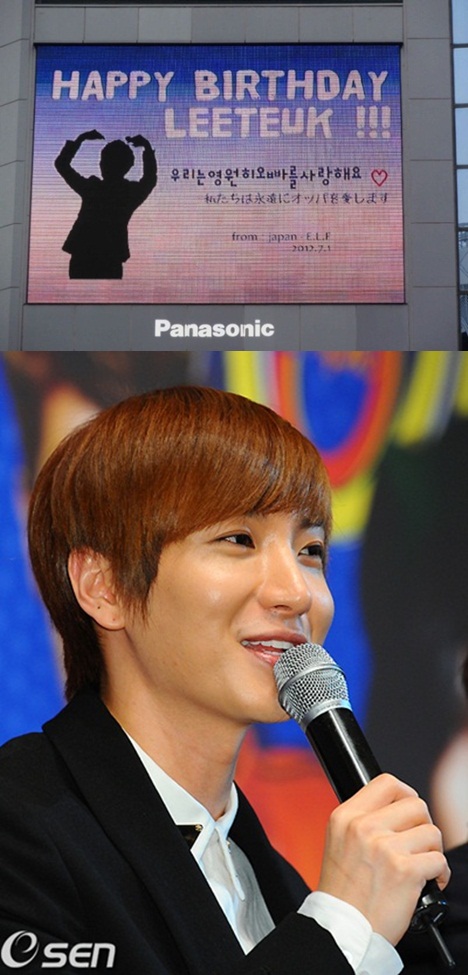 공개된 사진에는 일본 도쿄의 3대 번화가로 꼽히는 시부야의 한 건물 전광판에 뜬 이특의 생일 축하메시지가 담겼다. 전광판에는 '생일 축하해요 이특!(HAPPY BIRTHDAY LEETEUK!)' 우리는 영원히 오빠를 사랑해요 from. japan E.L.F 2012.7.1'이라고 적혀있다.