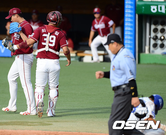 1일 오후 대구구장에서 열린 2012 팔도 프로야구 삼성 라이온즈와 넥센 히어로즈의 경기 1회말 2사 1,2루 삼성 박석민의 안타때 2루 주자 박한이가 넥센 최경철 포수에게 태그아웃됐다. 선발투수 김영민이 최경철과 하이파이브를 하고 있다.