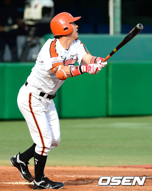 1일 대전구장에서 열린 '2012 팔도 프로야구' 한화 이글스와 KIA 타이거즈의 경기 1회말 1사 3루 장성호가 희생플라이로 타점을 올리고 있다.
