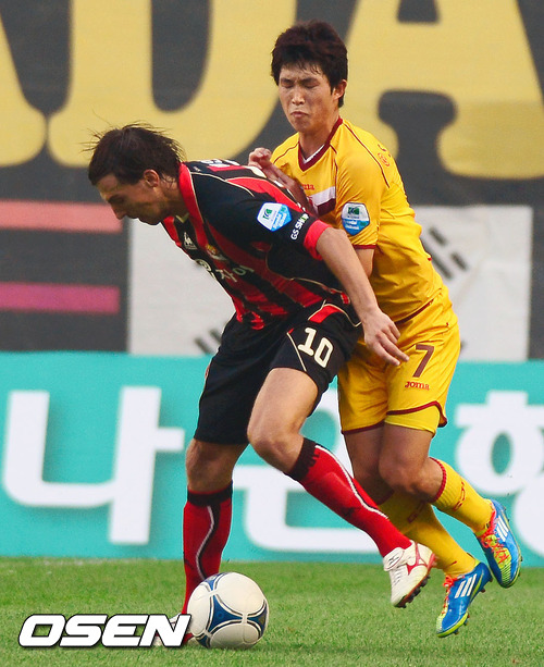1일 오후 서울월드컵경긱장에서 열린 '2012 K-리그' 19라운드 FC 서울과 광주 FC 경기 후반, 서울 데얀과 광주 이승기가 몸싸움을 하고 있다.