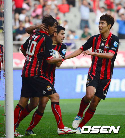 1일 오후 서울월드컵경긱장에서 열린 '2012 K-리그' 19라운드 FC 서울과 광주 FC 경기 후반,서울 데얀이 동점골을 넣고 동료들과 기뻐하고 있다.