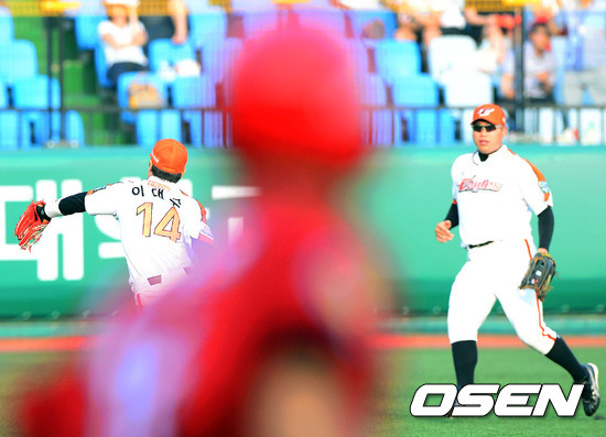 1일 대전구장에서 열린 '2012 팔도 프로야구' 한화 이글스와 KIA 타이거즈의 경기 6회초 2사 3루 조영훈의 안타성 타구를 이대수가 역모션으로 잡고 있다.