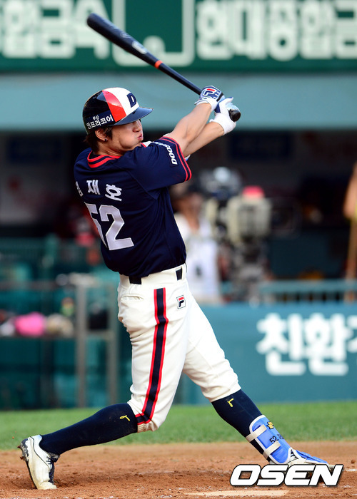 1일 서울 잠실구장에서 열린 '2012 팔도 프로야구' 두산 베어스와 롯데 자이언츠의 경기, 5회말 1사 1,3루 두산 김재호가 1타점 1루타를 치고 있다.
