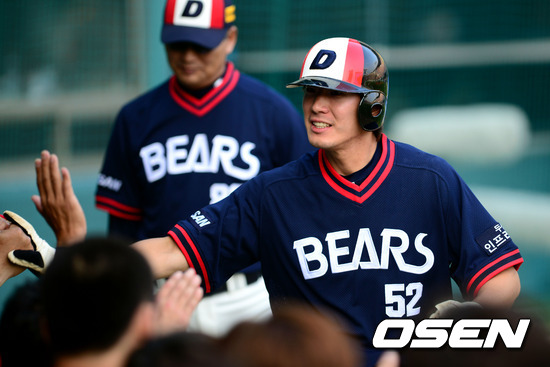 1일 서울 잠실구장에서 열린 '2012 팔도 프로야구' 두산 베어스와 롯데 자이언츠의 경기, 5회말 2사 2루 두산 최준석의 안타로 2루 주자 김재호가 득점 성공후 덕아웃에서 선수들과 기뻐하고 있다.