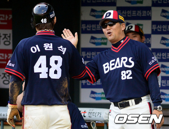 1일 서울 잠실구장에서 열린 '2012 팔도 프로야구' 두산 베어스와 롯데 자이언츠의 경기, 6회말 1사 1,2루 두산 이종욱의 안타로 2루 주자 이원석이 득점 성공후 김진욱 감독과 하이파이브를 하고 있다.