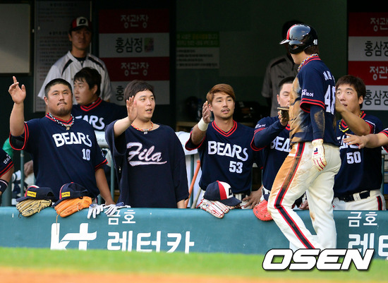 1일 서울 잠실구장에서 열린 '2012 팔도 프로야구' 두산 베어스와 롯데 자이언츠의 경기, 6회말 1사 1,2루 두산 이종욱의 안타로 2루 주자 이원석이 득점 성공후 덕아웃에서 선수들과 기뻐하고 있다.