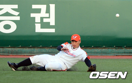 1일 대전구장에서 열린 '2012 팔도 프로야구' 한화 이글스와 KIA 타이거즈의 경기 7회초 1사 KIA 이준호의 타구를 한화 좌익수 최진행이 어설픈 수비로 뒤로 빠트려 1사 3루를 만들어 주고 있다.