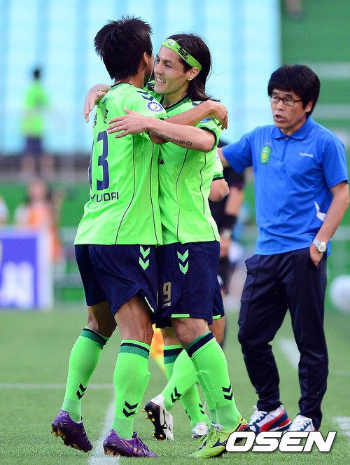 1일 오후 전주월드컵경기장에서 열린 '현대오일뱅크 K리그 2012' 전북 현대와 상주 상무의 경기 전반 드로겟이 경기 첫 골을 넣은 후 정훈과 포옹을 하고 있다.