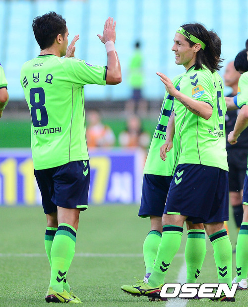 1일 오후 전주월드컵경기장에서 열린 '현대오일뱅크 K리그 2012' 전북 현대와 상주 상무의 경기 전반 드로겟이 경기 첫 골을 넣은 후 에닝요와 하이파이브를 하고 있다.