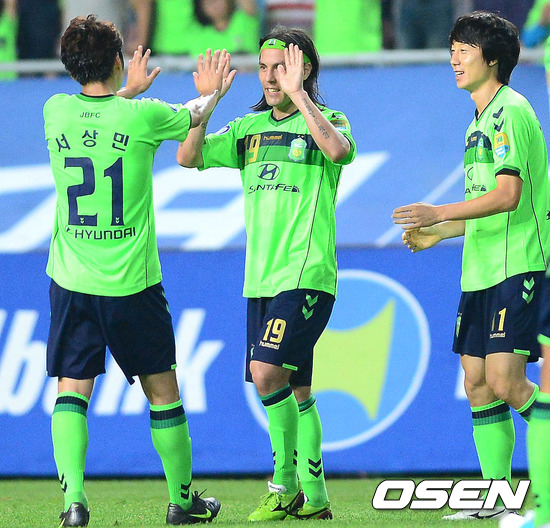 1일 오후 전주월드컵경기장에서 열린 '현대오일뱅크 K리그 2012' 전북 현대와 상주 상무의 경기 후반 드로겟이 골을 넣은 후 서상민과 하이파이브를 하고 있다.