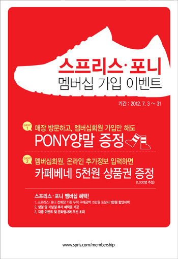 더불어 온라인 상의 가입 혜택도 푸짐하다. 오프라인 매장에서 멤버십을 가입하고, 스프리스 온라인 몰이나 홈페이지에서 추가 정보를 등록하면 1000명을 추첨해 ‘카페베네 상품권’을 선물한다. 스프리스 온라인 몰에서 멤버십에 가입하고, 제품을 구매해도 포니 양말 1족을 증정한다.