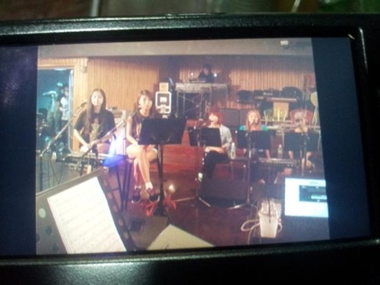 공개된 사진에서 원더걸스 멤버들은 편안한 옷차림으로 의자에 앉아 보면대에 놓여진 악보를 보며 노래 및 악기 합주를 맞춰 보고 있다.