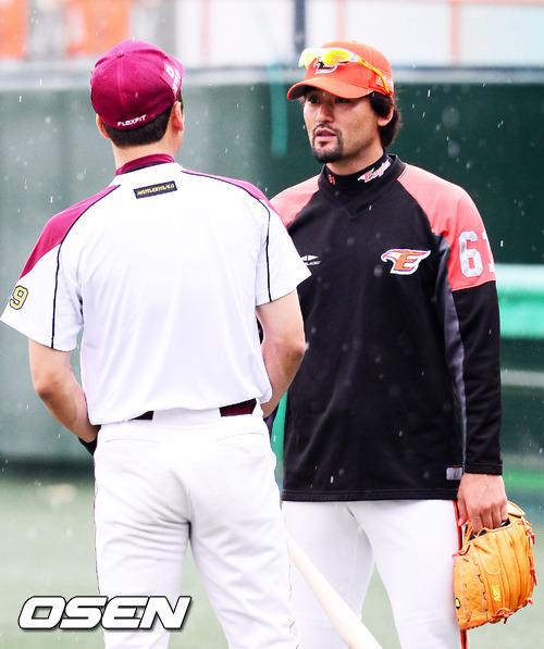 3일 오후 목동구장에서 '2012 팔도 프로야구' 넥센 히어로즈와 한화 이글스의 경기가 열릴 예정인 가운데 훈련 시간에 한화 박찬호가 넥센 이택근이 얘기를 나누고 있다.