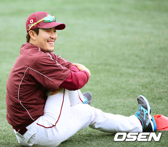 3일 오후 목동구장에서 '2012 팔도 프로야구' 넥센 히어로즈와 한화 이글스의 경기가 열릴 예정인 가운데 훈련 시간에 넥센 김병현이 몸을 풀며 환하게 미소짓고 있다.