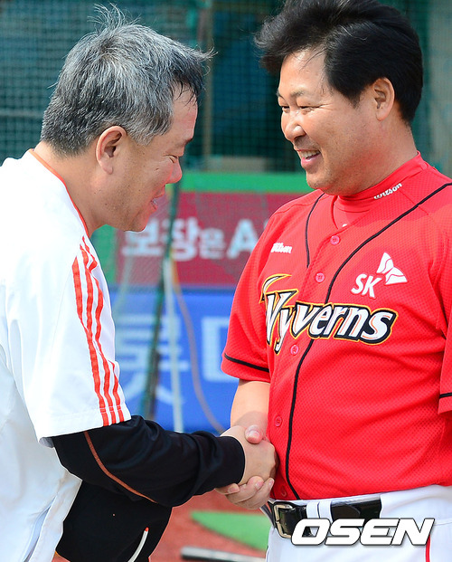 3일 오후 부산 사직구장에서 열린 '2012 팔도 프로야구' 롯데 자이언츠와 SK 와이번스의 경기, 경기전 3연패를 기록중인 롯데 양승호 감독과 SK 이만수 감독이 인사를 나누고 있다.