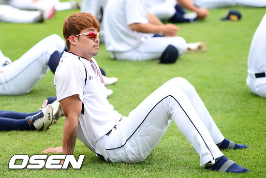 3일 오후 광주 무등야구장에서 열린 '2012 팔도 프로야구' KIA 타이거즈와 두산 베어스의 경기에 앞서 두산 오재원이 스트레칭 훈련을 하고 있다.