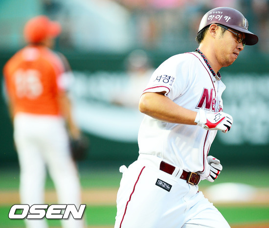 3일 오후 목동구장에서 열린 '2012 팔도 프로야구' 넥센 히어로즈와 한화 이글스의 경기에서 2회말 1사 주자 3루 넥센 오윤이 좌월 선취 투런홈런을 날린 후 그라운드를 돌고 있다.