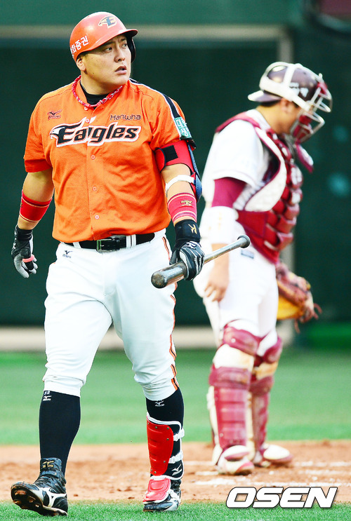 3일 오후 목동구장에서 열린 '2012 팔도 프로야구' 넥센 히어로즈와 한화 이글스의 경기에서 2회초 첫타석에서 한화 김태균이 삼진 아웃을 당한 후 아쉬운 표정을 짓고 있다.