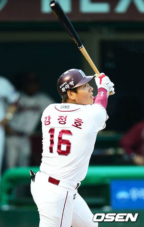 3일 오후 목동구장에서 열린 '2012 팔도 프로야구' 넥센 히어로즈와 한화 이글스의 경기에서 2회말 무사 주자 2루 열흘만에 1군에 복귀한 홈런 선두 넥센 강정호가 중견수 플라이 타구를 날리고 있다.