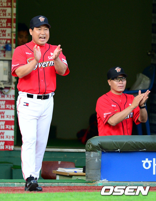 3일 오후 부산 사직구장에서 열린 '2012 팔도 프로야구' 롯데 자이언츠와 SK 와이번스의 경기, 4회초 2사 2,3루에서 SK 조인성이 역전 2타점 적시타를 날리자 이만수 감독이 기뻐하고 있다.