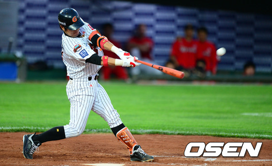 3일 오후 부산 사직구장에서 열린 '2012 팔도 프로야구' 롯데 자이언츠와 SK 와이번스의 경기, 4회말 1사 만루에서 롯데 강민호가 싹쓸이 3타점 적시 2루타를 날리고 있다.
