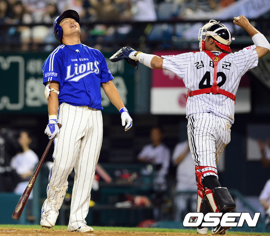 3일 오후 서울 잠실구장에서 열린 '2012 팔도 프로야구' LG 트윈스와 삼성 라이온즈의 경기 2회말 2사 3루 박한이가 삼진으로 아웃되자 아쉬운 표정을 짓고 있다.