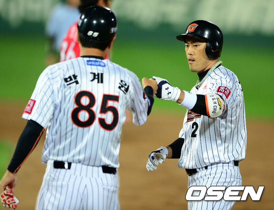 3일 오후 부산 사직구장에서 열린 '2012 팔도 프로야구' 롯데 자이언츠와 SK 와이번스의 경기, 5회말 2사 1,3루에서 롯데 조성환이 1타점 적시타를 날리고 박계원 코치와 주먹을 맞대고 있다.