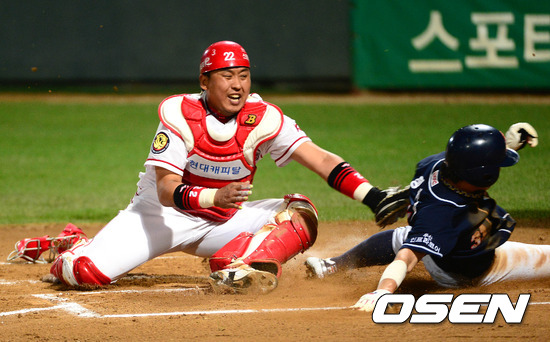 3일 오후 광주 무등야구장에서 열린 '2012 팔도 프로야구' KIA 타이거즈와 두산 베어스의 경기, 6회초 1사 1,3루 두산 이성열의 삼진때 이중도루 작전을 펼친 3루주자 정수빈이 홈에서 태그아웃 처리되고 있다.