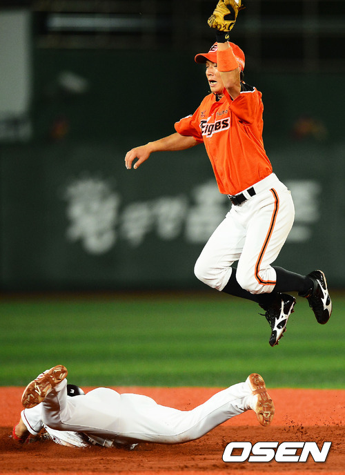 3일 오후 목동구장에서 열린 '2012 팔도 프로야구' 넥센 히어로즈와 한화 이글스의 경기에서 6회말 2사 주자 1루 넥센 유재신 타석에서 1루 주자 김민성이 2루 도루에 성공하고 있고 한화 유격수 백승룡이 태그에 실패하고 있다.