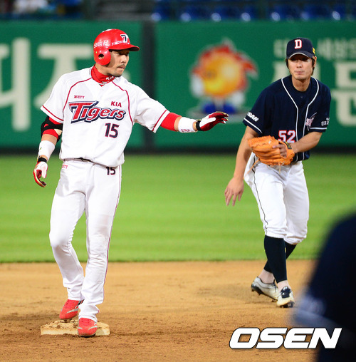 3일 오후 광주 무등야구장에서 열린 '2012 팔도 프로야구' KIA 타이거즈와 두산 베어스의 경기, 6회말 2사 2루 KIA 이용규가 우전 적시 2루타를 치고 타임을 외치고 있다.