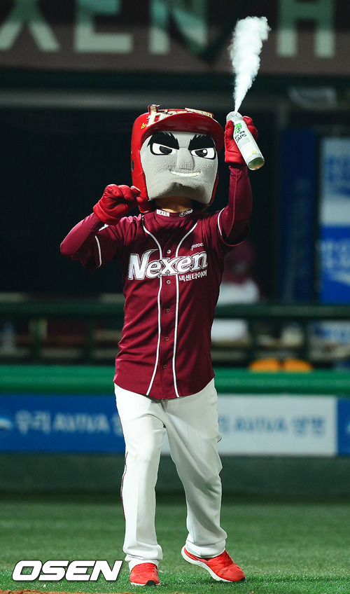 3일 오후 목동구장에서 열린 '2012 팔도 프로야구' 넥센 히어로즈와 한화 이글스의 경기에서 넥센 턱돌이가 모기약을 뿌리고 있다.