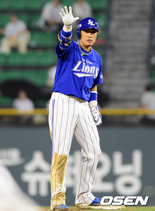 3일 오후 서울 잠실구장에서 열린 '2012 팔도 프로야구' LG 트윈스와 삼성 라이온즈의 경기 5회초 무사 1,2루 이승엽이 1타점 2루타를 치고 2루에서 손을 들어보이고 있다.