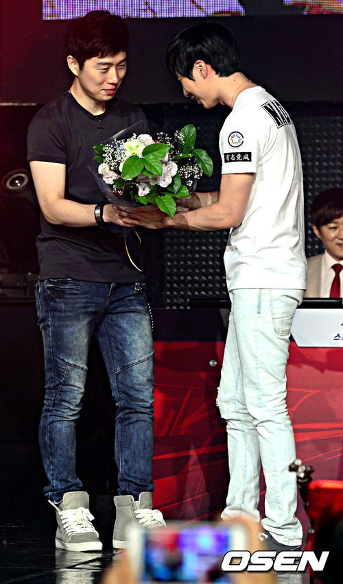 한국 e스포츠의 대표 아이콘 '천재테란' 이윤열(oGs)의 은퇴식이 3일 저녁 서울 용산구 e스포츠 상설 경기장에서 열려 임요한이 이윤열에게 꽃다발을 전달하고 있다.