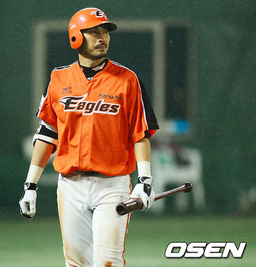 3일 오후 목동구장에서 열린 '2012 팔도 프로야구' 넥센 히어로즈와 한화 이글스의 경기에서 8회초 2사 주자 2루 한화 김경언이 타석에서 삼진아웃을 당한 후 아쉬운 표정으로 그라운드를 바라보고 있다.
