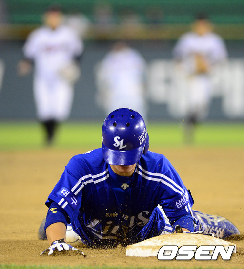 3일 오후 서울 잠실구장에서 열린 '2012 팔도 프로야구' LG 트윈스와 삼성 라이온즈의 경기 7회초 선두타자 조동찬이 우중간 3루타를 친후 3루에서 세이프되고 있다.