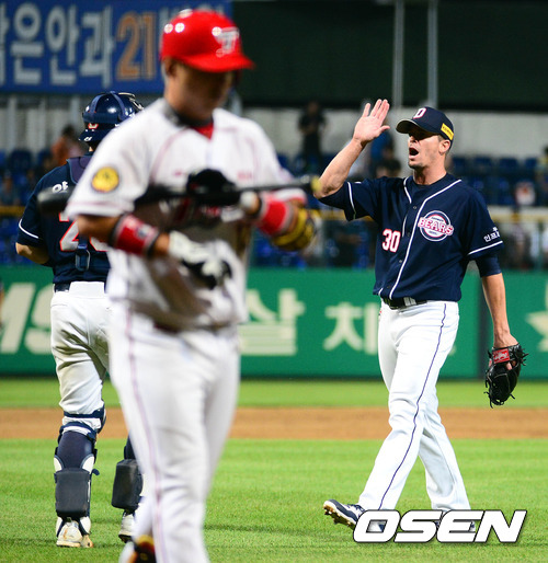 경기 후 두산 프록터가 양의지와 승리의 기쁨을 나누고 있다. / sunday@osen.co.kr