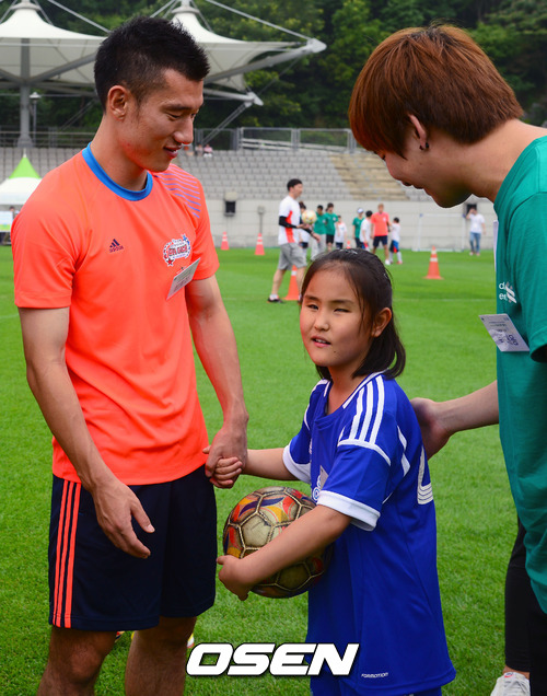 'Seeing is Believing’ 캠페인의 일환으로, 4일 서울 월드컵경기장 내 보조경기장에서 열린 2012 K리그 올스타와 함께‘Seeing is Believing 유소년 축구 클리닉’에 참가한 상주 최효진이 시각장애인 어린이 손을 잡으며 이야기를 들어주고 있다.