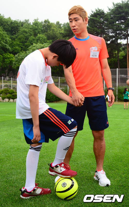'Seeing is Believing’ 캠페인의 일환으로, 4일 서울 월드컵경기장 내 보조경기장에서 열린 2012 K리그 올스타와 함께‘Seeing is Believing 유소년 축구 클리닉’에 참가한 울산 이근호가 시각장애인 어린이의 손을 잡고 공놀이를 하고 있다.