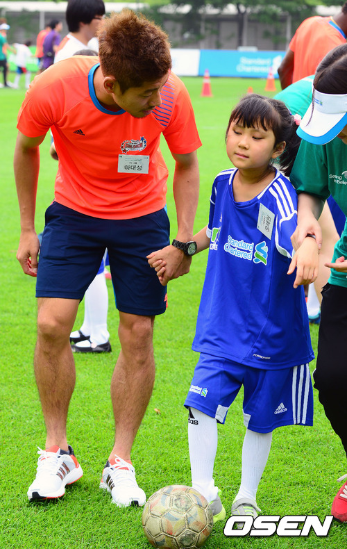 'Seeing is Believing’ 캠페인의 일환으로, 4일 서울 월드컵경기장 내 보조경기장에서 열린 2012 K리그 올스타와 함께‘Seeing is Believing 유소년 축구 클리닉’에 참가한 서울 하대성이 시각장애어린이를 허리숙여 바라보고 있다.