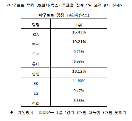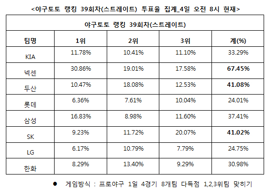 2012 프로야구 대상 야구토토 랭킹 39회차 투표율 중간집계 결과