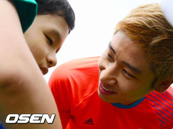 'Seeing is Believing’ 캠페인의 일환으로, 4일 서울 월드컵경기장 내 보조경기장에서 열린 2012 K리그 올스타와 함께‘Seeing is Believing 유소년 축구 클리닉’에 참가한 울산 이근호가 허리숙여 시각장애 어린이와 대화를 하고 있다.