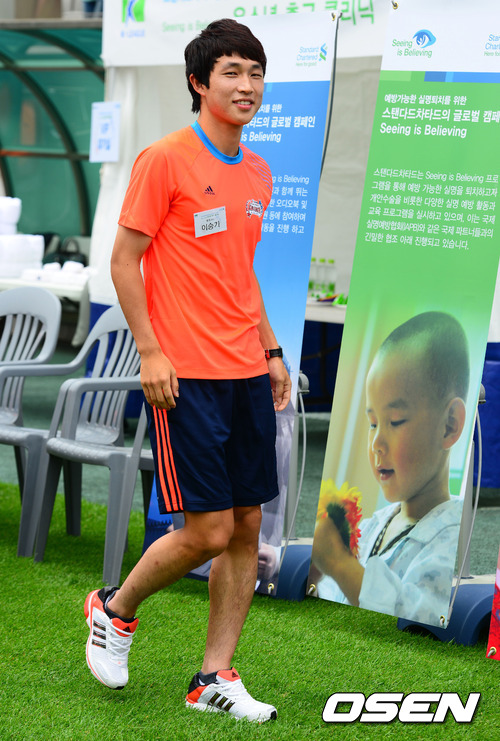 'Seeing is Believing’ 캠페인의 일환으로, 4일 서울 월드컵경기장 내 보조경기장에서 열린 2012 K리그 올스타와 함께‘Seeing is Believing 유소년 축구 클리닉’에 참가한 광주 이승기가 포토월로 입장하고 있다.