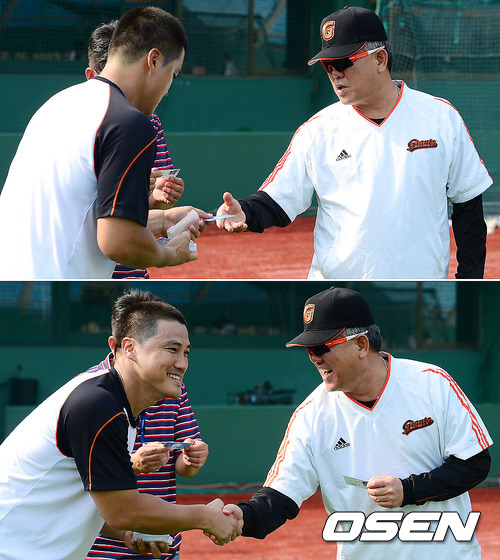 4일 오후 부산 사직구장에서 열린 2012 팔도 프로야구 롯데 자이언츠와 SK 와이번스의 경기, 경기전 롯데 홍성흔이 이탈리안 레스토랑을 개업한 아내의 가게를 홍보하기 위해 양승호 감독에게 명함을 건네며 즐거워하고 있다.