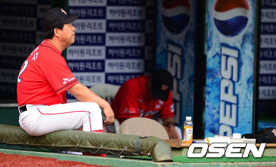 4일 오후 부산 사직구장에서 열린 2012 팔도 프로야구 롯데 자이언츠와 SK 와이번스의 경기, 경기전 SK 이만수 감독이 더그아우셍서 심각한 표정을 짓고 있다. SK는 4연패 기록중.
